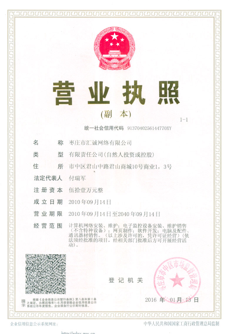 特提供三證合一后的新營(yíng)業(yè)執(zhí)照副本如下 棗莊市匯誠(chéng)網(wǎng)絡(luò)有限公司營(yíng)業(yè)執(zhí)照(統(tǒng)一社會(huì)信用代碼:9137040256144770XY)